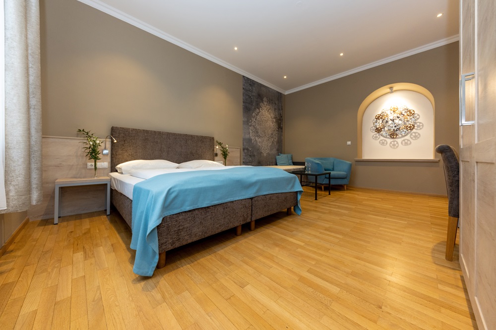 Harmonische Stoffe und Farben, bequeme Boxspringbetten und edler Parkettboden. Perfekt für mehrere Tage in Krems.